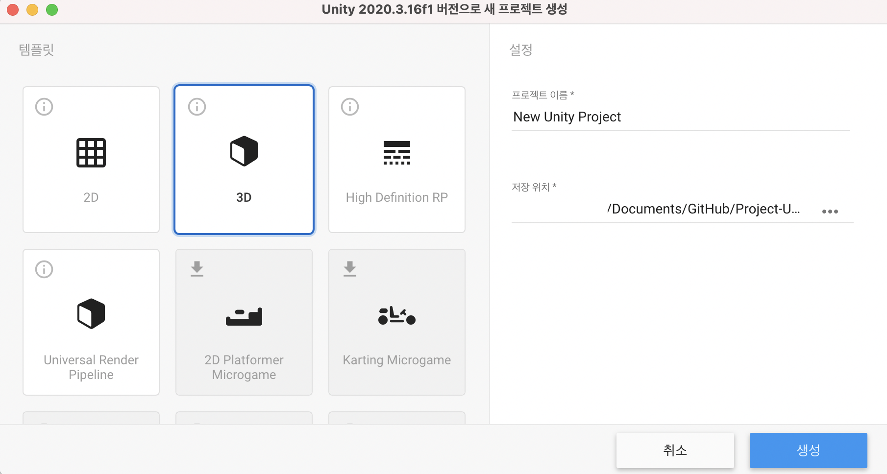 아래는 유니티 허브에서 새 프로젝트를 생성하는 화면이다.